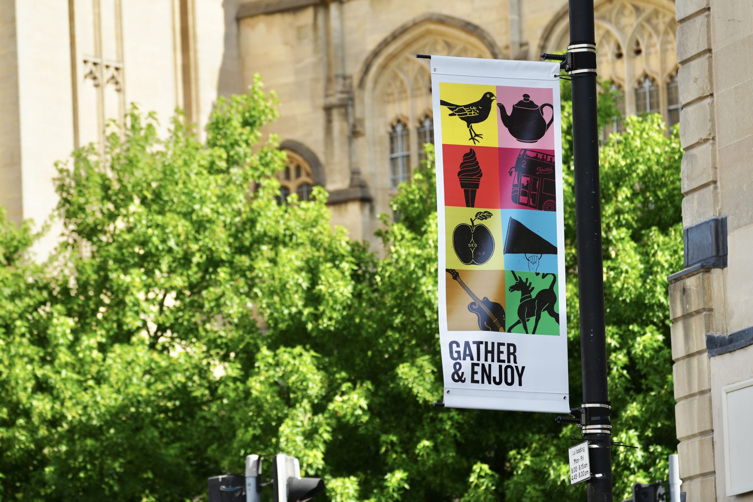 Commissioned by Bristol City Centre BID in partnership with Bristol City Council and a working group of local businesses chaired by Ren Renwick from the RWA, PS. With Love takes its name from Park Street and serves as a visual love letter to the area. Designed by Bristol-based letterpress artist Nick Hand and illustrator Hannah Cousins, the artworks combine printmaking and illustration to capture the essence of the neighbourhood – from Alfred the Gorilla, the beloved former resident of Bristol Zoo, to the HMS Bristol bell hidden in the Lord Mayor’s Chapel. Other symbols include the Park Street hill tackled by cyclists, the Queen’s Road flower stall and objects like books and paint pots that hint at creativity and learning.
