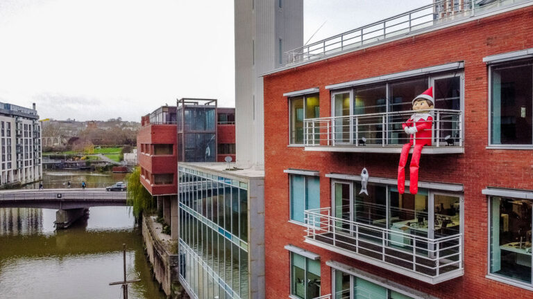 The enormous 15 ft tall The Elf on the Shelf, wearing the iconic red suit and hat with white trim, white collar and mittens, appeared atop several of the city’s buildings. From some of the city’s highest vantage points, The Elf on the Shelf was the perfect early present to kids throughout Bristol, who were be delighted to spot the elf in a larger-than-life game of hide and seek.